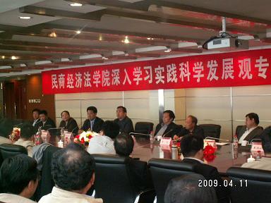 4月11日上午8点至12点,学院举行了深入学习实践科学发展观思想大解放专题研讨,会议由院分党委书记王光进主持,校长黄进教授莅临本次会议。会议分为两个阶段,第一阶段为分组讨论,第二阶段为大会集中交流。会议讨论的主题:一是以科学发展观为指导,如何提升科研水平和竞争力,二是以科学发展观为指导,如何加强师德师风建设。各小组围绕这两个主题,开展了思想大解放,本着求真务实,科学发展的精神,进行了热烈的讨论。老师们畅谈了各自的想法,并对学院和学校的相关工作提出意见和建议。在大会集中交流阶段,民事诉讼法研究所党支部书记邱星美副教授、知识产权研究所张广良副教授、经济法研究所刘继峰副教授、商法研究所所长王涌教授分别代表各自的小组做了汇报和发言。